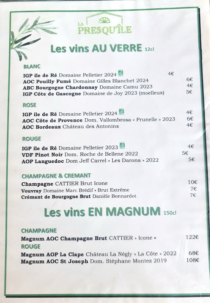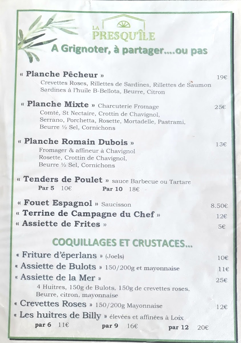 Welcome to La Presqu'ile, a culinary gem nestled in the heart of Loix on the stunning Île de Ré. This charming eatery is renowned for its vibrant menu that features a delightful symphony of flavors. Guests rave about the succulent cuttlefish and the hearty burgers, showcasing the restaurant's commitment to fresh, high-quality ingredients. The mussels served with perfectly crisp fries are another highlight, offering a taste of coastal authenticity.